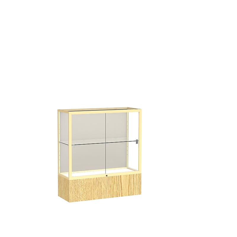Ghent X Light Oak Metal & Glass Trophy Display Case with built-in lock features sliding tempered glass doors that provide easy access to trophies and other accessories. This case is available in light oak finish. Color & Material: Light Oak Metal & Glass. Dimension: 40"H 36"W 14"D. Type: Display Case. Number of Shelves: 4. Built-in Lock: Yes. Features: Sliding Glass Doors for Easy Access to Contents. ⚠ WARNING: This product can expose you to chemicals including Wood Dust, which are known to the State of California to cause cancer. For more information, visit www. P65Warnings. ca. gov. Ghent X Light Oak Metal & Glass Trophy Display Case - Features sliding tempered glass doors for easy access.