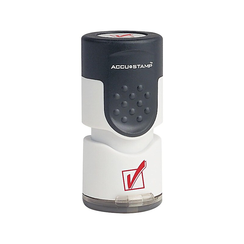 Streamline the process of marking office documents and classroom paperwork by using this automatic-inking,check mark stamp with a 0. 6" diameter. This Accu-Stamp pre-inked check mark stamp boasts durable construction to handle thousands of impressions before needing to be re-inked. Pre-inked stamp is refillable and provides thousands of impressions. Design: check mark. Re-inkable with pre-inkedrefill ink. Imprint size: 0. 63" diameter. Mark documents quickly with this Accu-Stamp pre-inkedcheck mark stamp.