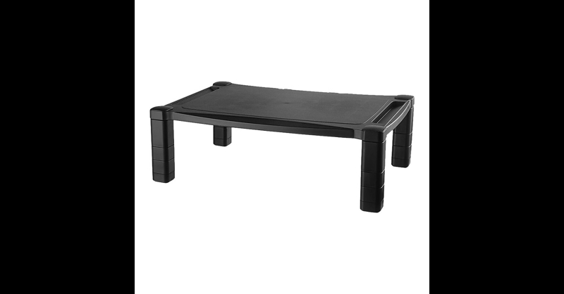 Improve the viewing angle of most monitors with this adjustable stand. The wide base also supports heavier devices including printers and fax machines, and additional storage area underneath the base improves overall desktop organization. Additional fixtures on this Kantek stand help manage video connections or cables that power the monitor and a variety of other devices. Raise your monitor to a comfortable viewing height with this extra wide deluxe monitor stand. Height adjusts from 3" to 6. 5" for comfortable viewing. Extra large, sturdy plastic platform easily accommodates even larger laptops and provides years of use. Dimensions: 3-6. 5"H x 20"W x 13. 25"D. Comes finish and features integrated cable management. Elevate a monitor to a more comfortable viewing height using this Kantek wide stand.
