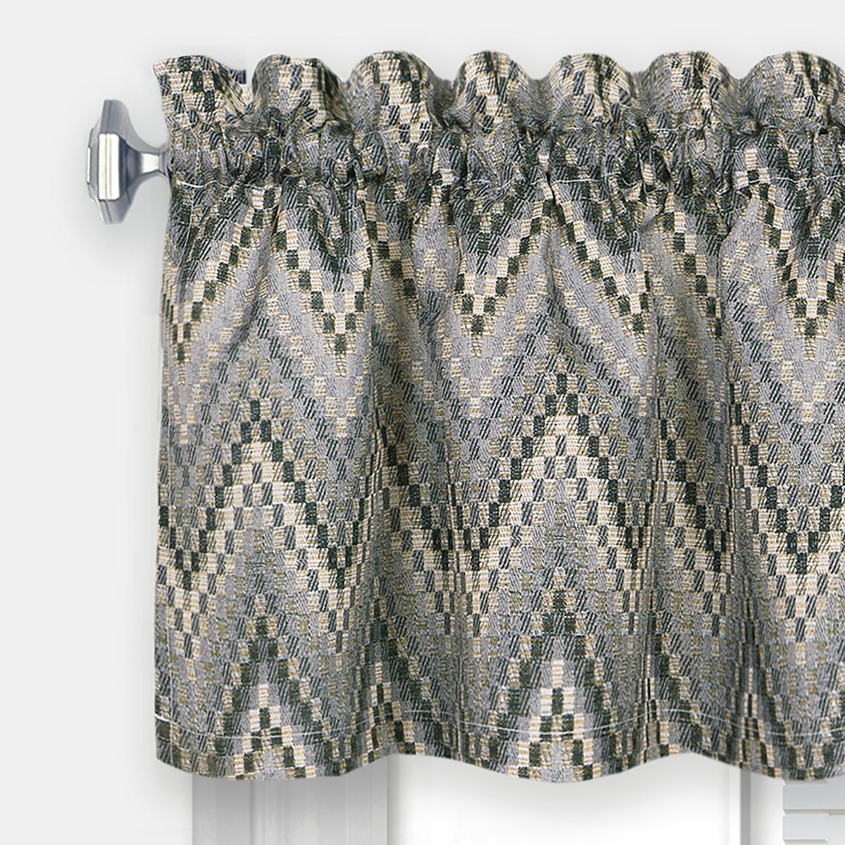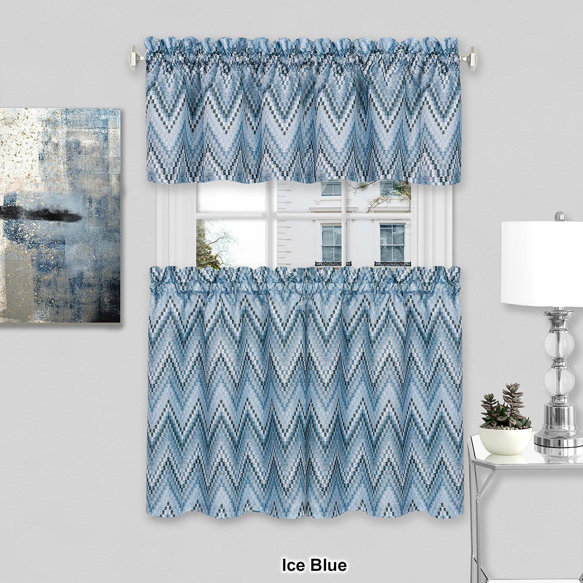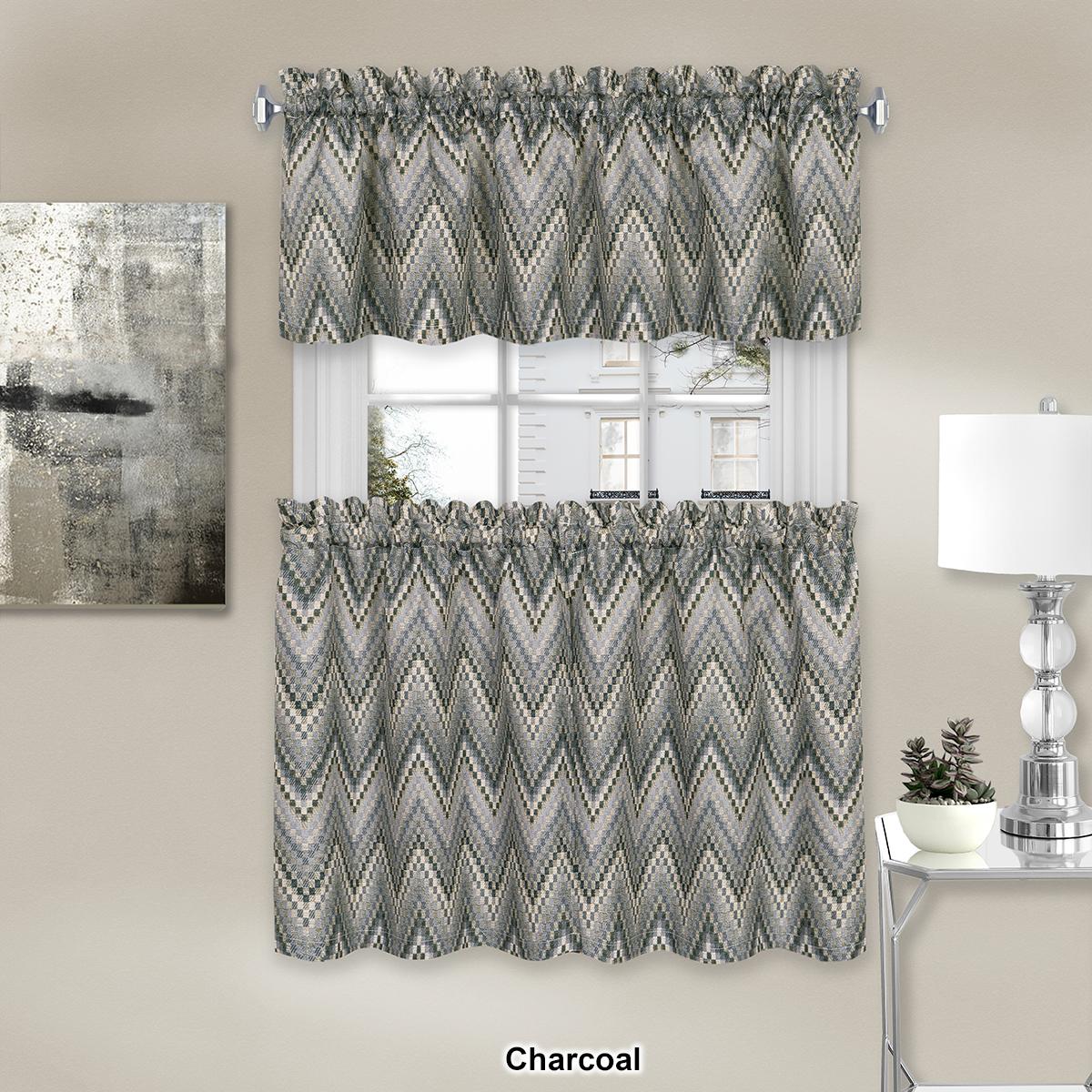 The Achim Avery kitchen curtain tier set offers a fabulous chevron print that interprets a woven look. Light to dark gradational colors produces an extraordinary curtain ensemble, perfect for accenting any window. Each piece has a one and a half inch rod pocket that allows for easy shirr on rod installation. Includes: (1) valance and (2) tiers.