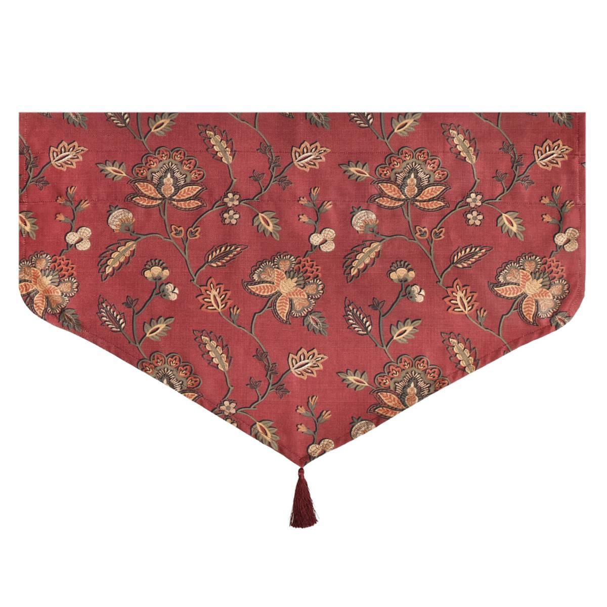 The Royal Court Bari jacquard ascot valance features a lovely Jacobean floral print in tones of light green, gold, and spice, on a crimsontextured ground. It is finished with a mingle tassel trim, carefully inserted in the point of the ascot. To achieve the look in the photo we recommend using 3 valances (each sold separately). Includes: (1) Window Ascot Valance Shown: Three Window Ascot Valances.