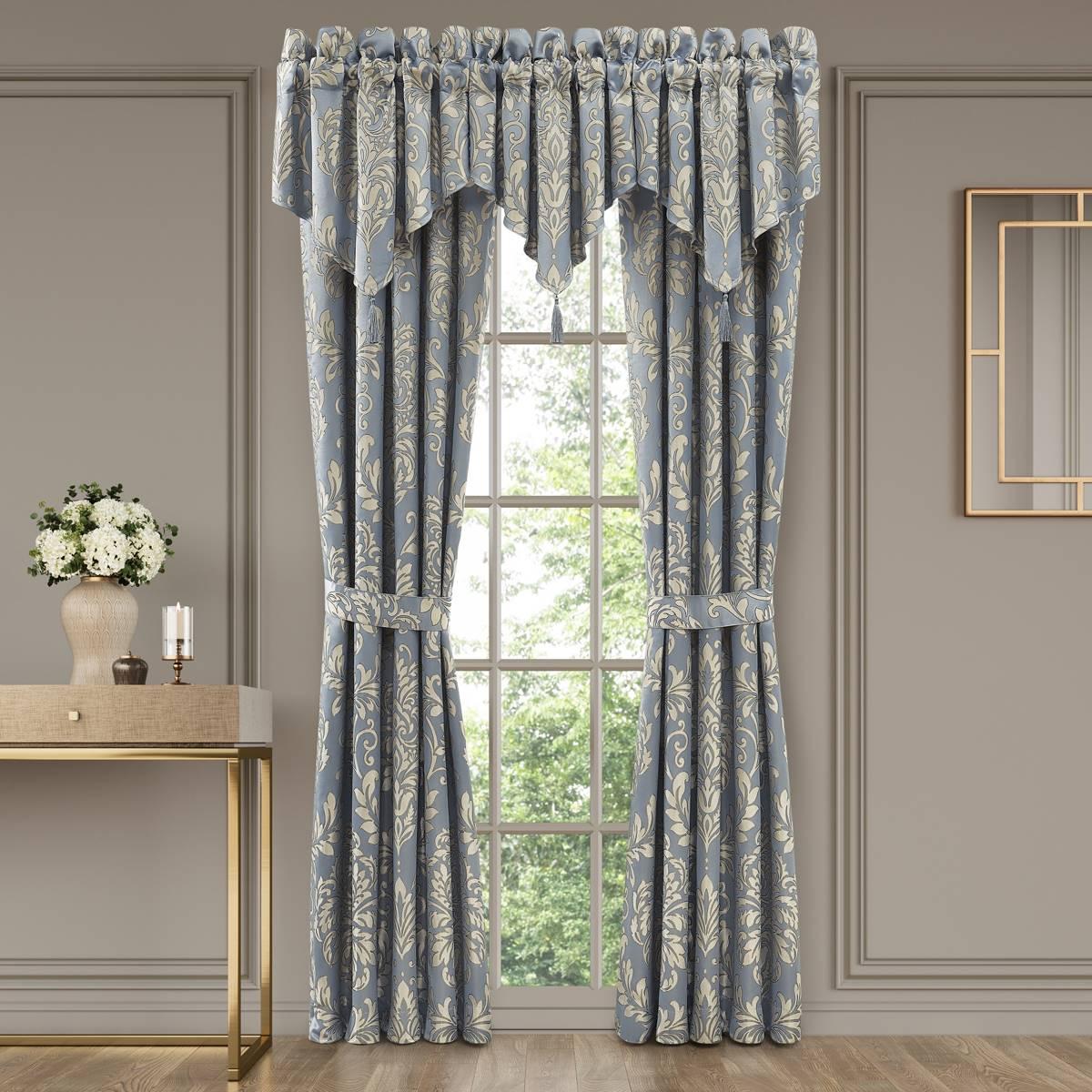 The Royal Court Lorenzo Damask window ascot valance features an elegant woven damask design. The cream tones are woven on a softtexture fabric, and it is finished with a tassel trim for added detail and elegance. Pair this valance with the Lorenzo window panels and bed set to complete the look. To achieve the look in the photo we recommend using 3 valances (each sold separately). Polyester. Dry Clean. Size: 21x40 Includes: (1) Window Ascot Valence Shown: Three Window Ascot Valences.