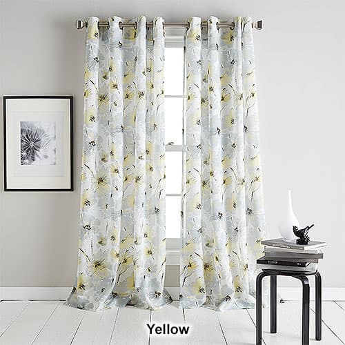 The Modern Bloom grommet curtain panel from DKNY is a chic, stylish window solution. Featuring beautiful, watercolor-inspired flowers on a woven,semi-sheer fabric, this curtain will add an updated, romantic look to your home decor. DKNY panels boast superior quality and are finished with extra-wide, weighted hems that allow your panels to drape elegantly. 100% Polyester. Machine wash. Wash with like colors. Use only non-chlorine bleach when needed. Line dry. Iron on lowest setting as needed. 1 Panel is included per package. Sizes: 50x63 or 50x84. Shown: Two 84" panels.