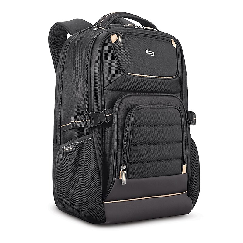 Carry all of your everyday working essentials with ease with these laptop backpacks. Equipped with adjustable shoulder straps, these backpacks hold up to a 17. 3" inch laptop and also have a special compartment for an iPad or other type of tablet. Retrieve larger items from the front storage compartment with ease, and use the front zip-down organizer to better manage your smaller media accessories. Equipped with a Rear Ride Along strap that slides over your luggage handle, this backpack helps you better manage your bags while traveling. Fully padded laptop compartment fits up to 17. 3". Internal iPad/ tablet pocket. Front zip-down organizer section with key clip Adjustable shoulder straps ensure your optimal fit throughout use. Expandable front compartment for easy access. Overall dimensions are 19"H x 12. 5"L x 5. 5"W. Back panel slides over luggage handle, allowing you to transport the bag along with your luggage. Unisex design. 5-year manufacturer limited warranty. Multi-functional side mesh pockets, a file pocket, a front zip-down organizer section and a quick access pocket for all of your personal working essentials. Solo Pro laptop bags contain numerous compartments for your working essentials.