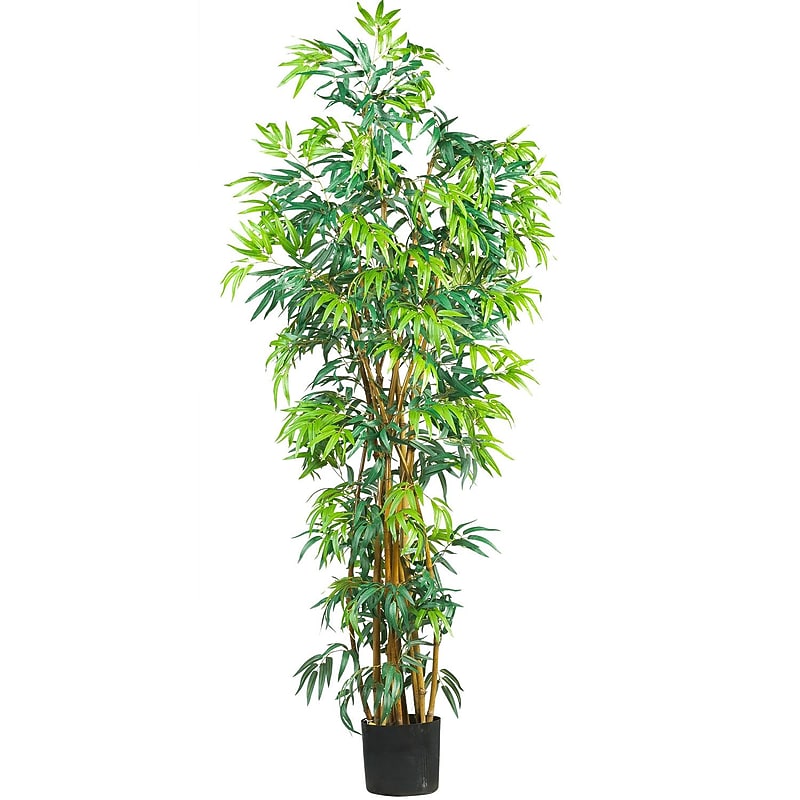 Featuring an authentic look, this "Nearly Natural Curved Bamboo Silk Tree in Pot" is a wonderful decorative accent for your home or office. This floor plant accessory can be used to brighten up any space. With a natural-looking green hue, the bamboo plant has a beautiful authentic look and feel. This pot paired with the plant make a wonderful accessory for your home. Ideal for indoor use, this plant adds greenery to your space without any need of watering or trimming. Available with pot, it can be easily used in any space. Color: Green. Overall Dimensions: 72"H x 36"W x 36"D. Vase: 7"H x 7. 75"W. 1700 Leaves. Beautiful intertwining natural trunks. Bring a natural feeling in to your home with the 'Nearly Natural Curved Bamboo Silk Tree in Pot'.