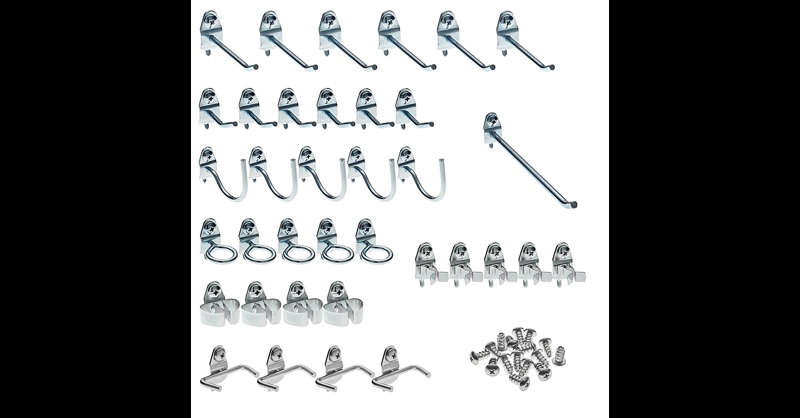 Meet all your pegboard requirements with the Triton Products DuraHook 36-piece hook Kit that features a wide range of hook styles. Lock the hooks in place with a locking tab that mounts to the pegboard from the front. There is no need to remove the board for repositioning or installation as these DuraHooks install from the front. Store large, heavy and odd shaped items with these hooks that mount vertically and horizontally in 4 distinct positions. This kit can be used on any 1/8" or 1/4" pegboard. Innovative double-locking system locks the hook in place with a locking tab that mounts to the pegboard from the front. Unique DuraHook styles can handle any pegboard storage requirement. Hooks mount vertically and horizontally in four distinct positions allowing the use of multiple hooks for large, heavy and odd shaped items. Fixtures install from the front so ther is no need to remove the board for installation or repositioning of DuraHooks. Hooks included are: (6) 1 In. Single Rod 30 Degree Bend; (1) 6 In. Single Rod 30 Degree Bend; (6) 2-1/2 In. Single Rod 30 Degree Bend; (4) Pliers/Wrench Holders; (5) Extended Spring Clips; (4) Standard Spring Clips; (5) Single Ring Tool Holders; (5) Curved Hooks. Storage of spare parts and accessories becomes easy with this DuraHook Kit.