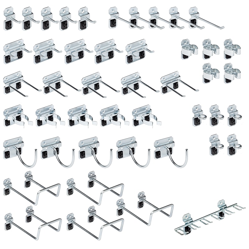 The LocHook is an innovative pegboard hook which can be mounted in any direction and is rugged enough to support just about anything. There is no need to remove the pegboard for repositioning or installation as these LocHooks install from the front. Store large, heavy and odd shaped items with these hooks that mount vertically and horizontally in 4 distinct positions. LocHooks and LocBoards present an ideal steel pegboard tool storage solution that supports 5S and Lean Manufacturing initiatives. Unique heavy-duty LocHook styles can handle any pegboard storage requirement. The 2 and 4-point contact locking mechanism offers industrial strength holding capability. Hooks mount vertically and horizontally in 4 distinct positions allowing the use of multiple hooks for large, heavy and odd-shaped items. LocHooks install from the front so there is no need to remove the board for installation or repositioning of LocHooks. Includes: (5) 1 In. Single Rod 30 Degree Bend; (5) 4 In. Single Rod 30 Degree Bend; (5) 1 In. Double Rod 30 Degree Bend; (5) 3 In. Double Rod 30 Degree Bend; (5) Extended Spring Clip/Spray Can Holders; (5) Standard Spring Clips; (5) Single Ring Tool Holders; (5) 3-3/4 In. Curved Hooks; (5) Double Closed End Loops; (1) Multi-Prong Tool Holder. These industrial strength hooks, with patented 2 and 4-point contact locking mechanisms for metal to metal holding capacity, offer users the unique ability to store tools and other items both horizontally and vertically.