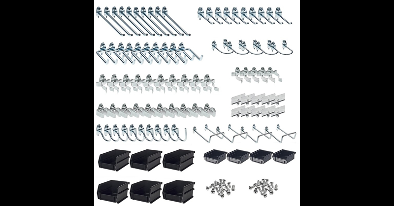 Meet all your pegboard requirements with the Triton Products DuraHook 95-piece hook kit that features a wide range of hook styles and bins. Lock the hooks in place with a locking tab that mounts to the pegboard from the front and prevent your tools and storage items from falling off the pegboard. With 4 distinct positions for vertical and horizontal mounting you can make use of multiple hooks for heavy, large and odd-shaped items. This kit can be used on any 1/8" or 1/4" pegboard. Innovative double-locking system locks the hook in place with a locking tab that mounts to the pegboard from the front. Unique DuraHook styles can handle any pegboard storage requirement. Hooks mount vertically and horizontally in four distinct positions allowing the use of multiple hooks for large, heavy and odd shaped items. Fixtures install from the front so ther is no need to remove the board for installation or repositioning of DuraHooks. Hooks included are: (10) 2-1/2 In. Single Rod 30 Degree Bend; (10) 6 In. Single Rod 30 Degree Bend; (10) 2-3/4 In. Double Rod 80 Degree Bend; (10) Extended Spring Clips; (10) Standard Spring Clips; (10) Curved Hooks; (5) 2-3/4 In. Double U-Shape; (5) Spring Clip/Can Holders; (5) 5 In. Double Closed End Loop; (10) BinClips and (10) Plastic Hanging Bins. Attach this DuraHook Kit to your pegboard and manage tools and small parts easily.