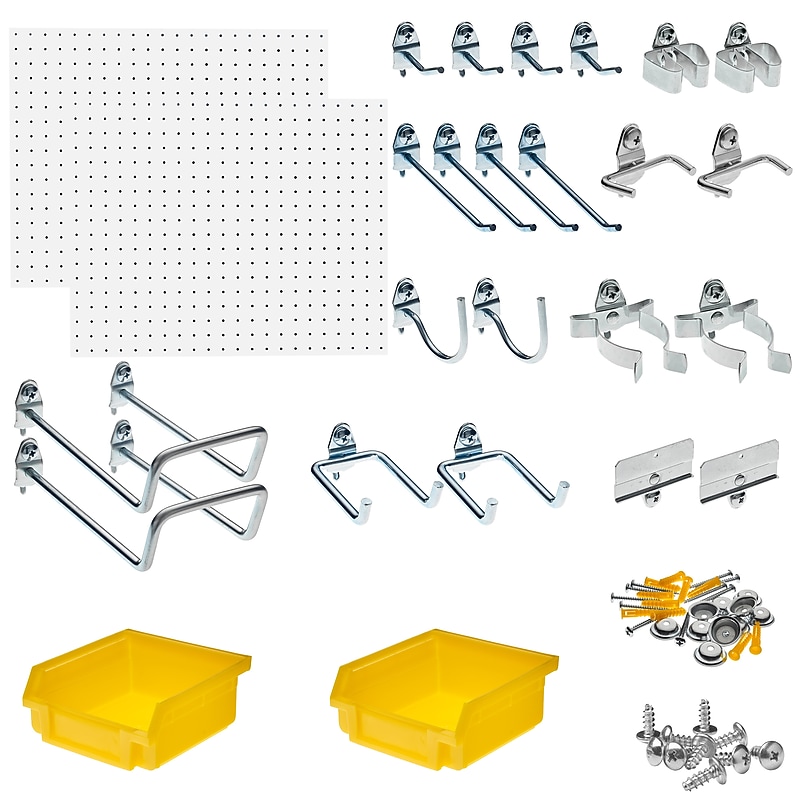 Mount the Triton Products DuraHook wall organizer on your wall to clean up your space and keep things in order. This wall organizer is washable, virtually indestructible and includes two bins as well as two bin clips to further help you stay organized. Also included with your DuraHook wall organizer are two 22" x 18" pegboards, eight single rod hooks, four double rod hooks, two curved hooks, and 10 spring clips. All mounting harware included. Innovative double-locking system locks the hook in place with a locking tab that mounts to the pegboard from the front. Unique DuraHook styles can handle any pegboard storage requirement. Hooks mount vertically and horizontally in four distinct positions allowing the use of multiple hooks for large, heavy and odd shaped items. Fixtures install from the front so ther is no need to remove the board for installation or repositioning of DuraHooks. Included in the system are: (2) 22 in. x 18 in. x 1/8 in. polypropylene pegboards, (4) 1 in. single rod 30 degree bend, (2) medium standard spring clips, (2) large extended spring clip/spray can holders, (2) 5 in. double loop hooks, (2) large standard spring clips, (2) extended spring clips, (2) 2-1/4 in. curved hooks, (4) 4 in. single rod 30 degree bend, (2) 2. 75 in. double rod, (2) plier/wrench holders, (2) plastic bins, (2) BinClips an mounting hardware. The DuraHook Wall Organizer helps you maximize your space and keeps everything within reach.