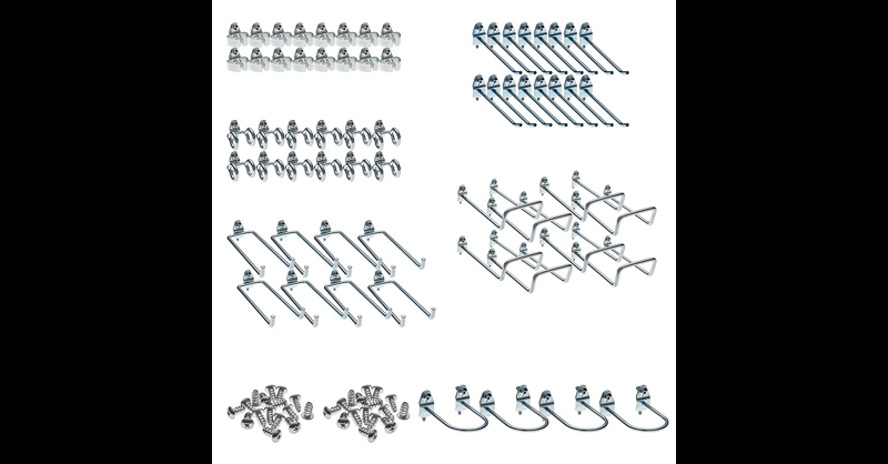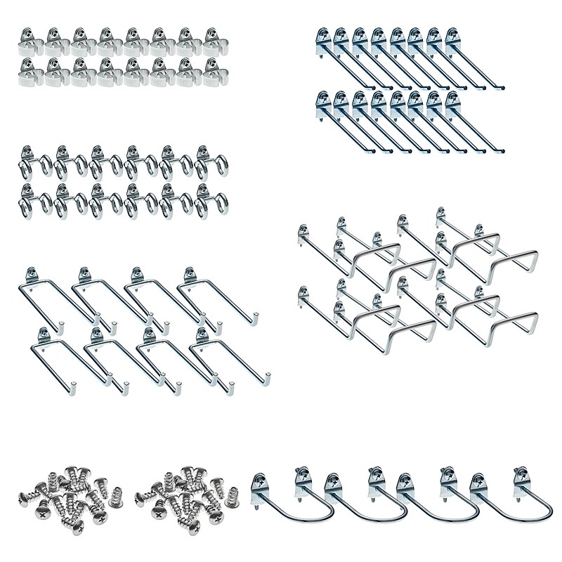 Meet all your pegboard requirements with the Triton Products DuraHook 64-piece hook Kit that features a wide range of hook styles. Lock the hooks in place with a locking tab that mounts to the pegboard from the front. There is no need to remove the board for repositioning or installation as these DuraHooks install from the front. Store large, heavy and odd shaped items with these hooks that mount vertically and horizontally in 4 distinct positions. This kit can be used on any 1/8" or 1/4" pegboard. Innovative double-locking system locks the hook in place with a locking tab that mounts to the pegboard from the front. Unique DuraHook styles can handle any pegboard storage requirement. Hooks mount vertically and horizontally in four distinct positions allowing the use of multiple hooks for large, heavy and odd shaped items. Fixtures install from the front so there is no need to remove the board for installation or repositioning of DuraHooks. Includes: (16) standard spring clips, (12) double ring hooks, (16) 4 In. single rods, (8) 6 In. double rods, (8) 8 In. double loop hooks, (4) U-Shaped tool holders. Attach this DuraHook Kit to your pegboard and manage tools and small parts easily.