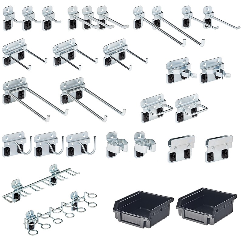 The LocHook is an innovative pegboard hook which can be mounted in any direction and is rugged enough to support just about anything. There is no need to remove the pegboard for repositioning or installation as these LocHooks install from the front. Store large, heavy and odd shaped items with these hooks that mount vertically and horizontally in 4 distinct positions. LocHooks and LocBoards present an ideal steel pegboard tool storage solution that supports 5S and Lean Manufacturing initiatives. Unique heavy-duty LocHook styles can handle any pegboard storage requirement. The 2 and 4-point contact locking mechanism offers industrial strength holding capability. Hooks mount vertically and horizontally in 4 distinct positions allowing the use of multiple hooks for large, heavy and odd-shaped items. LocHooks install from the front so there is no need to remove the board for installation or repositioning of LocHooks. Includes: (3) 1 in. Single Rod 30 degree bend: (3) 3 in. Single Rod 30 degree bend; (2) 4 in. Single Rod 30 degree bend; (2) 6 in. Single Rod 90 degree bend; (3) 3 in. Double Rod 90 degree bend; (2) 5-3/4 in. Double Rod 80 degree bend; (2) Extended Spring Clips; (2) Standard Spring Clips; (3) 2-1/4 Curved Hooks; (2) Closed End Hammer/Pliers Holders; (1) Multi-Prong Tool Holder; (1) Multi-Ring Tool Holder; (2) BinClips; (2) Black Plastic Hanging Bins. These industrial strength hooks, with patented 2 and 4-point contact locking mechanisms for metal to metal holding capacity, offer users the unique ability to store tools and other items both horizontally and vertically.