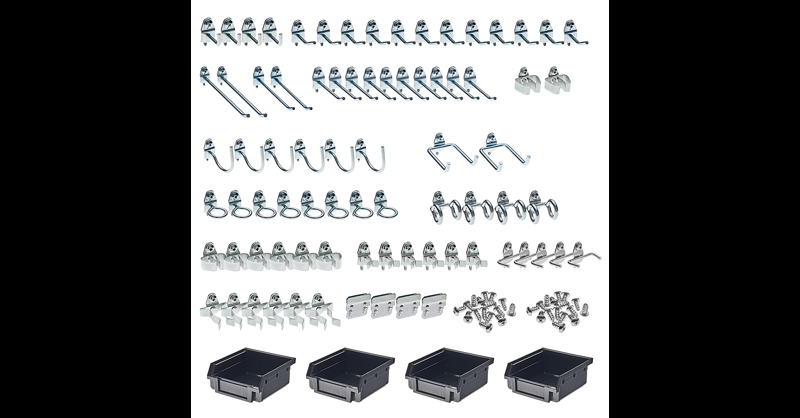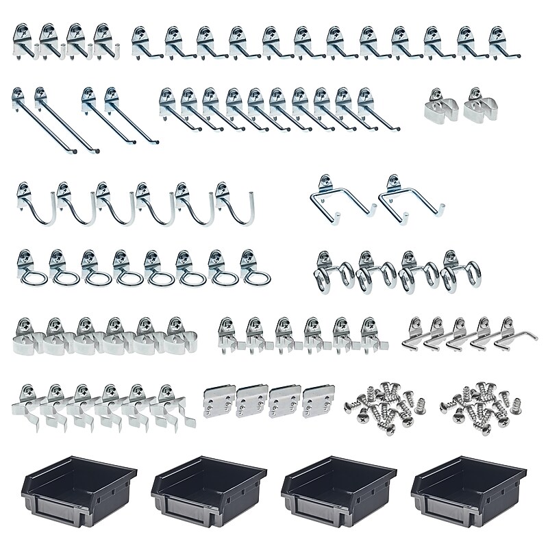 Meet all your pegboard requirements with the Triton Products DuraHook 83-piece hook Kit that features a wide range of hook styles and bins. Lock the hooks in place with a locking tab that mounts to the pegboard from the front. There is no need to remove the board for repositioning or installation as these DuraHooks install from the front. Store large, heavy and odd shaped items with these hooks that mount vertically and horizontally in 4 distinct positions. This kit can be used on any 1/8" or 1/4" pegboard. Innovative double-locking system locks the hook in place with a locking tab that mounts to the pegboard from the front. Unique DuraHook styles can handle any pegboard storage requirement. Hooks mount vertically and horizontally in four distinct positions allowing the use of multiple hooks for large, heavy and odd shaped items. Fixtures install from the front so ther is no need to remove the board for installation or repositioning of DuraHooks. Hooks included are: (4) 1 In. single rod 90 degree bend; (12) 1 In. Single Rod 30 Degree Bend; (10) 2-1/2 In. Single Rod 30 Degree Bend; (2) 4 In. Single Rod 30 Degree Bend; (2) 6 In. Single Rod 30 Degree Bend; (5) plier/wrench holders; (2) 2-3/4 In. Double Rod 80 Degree Bend; (12) Extended Spring Clips; (8) Standard Spring Clips; (6) Curved Hooks; (8) Single Ring Tool Holders; (4) Double Ring Tool Holders; (4) BinClips and (4) Plastic Hanging Bins. Attach this DuraHook Kit to your pegboard and manage tools and small parts easily.