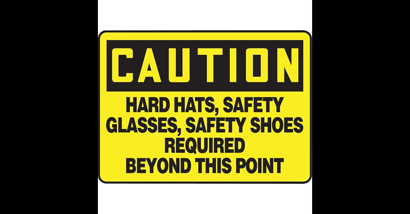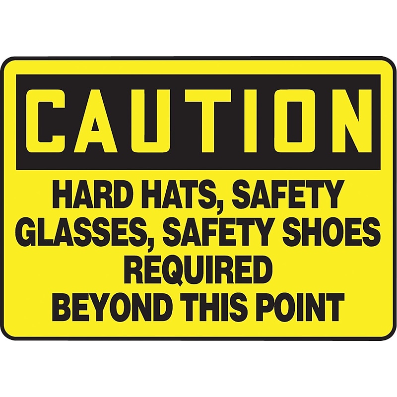 Safety sign made of adhesive vinyl. Measures x 10". CAUTION HARD HATS, SAFETY GLASSES, SAFETY SHOES REQUIRED BEYOND THIS POINT. 004" thick Adhesive Vinyl. x 10". Square corners and scored backing for quick peel-off and application. Printed matte surface with permanent acrylic adhesive. Moisture-resistant. Indoor or sheltered environments. Complies with OSHA 29 CFR 1910. 145 and ANSI Z535 requirements.