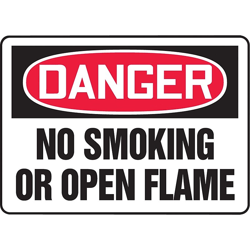 Safety sign made of adhesive vinyl. Measures x 10". DANGER NO SMOKING OR OPEN FLAME. 004" thick Adhesive Vinyl. x 10". Square corners and scored backing for quick peel-off and application. Printed matte surface with permanent acrylic adhesive. Moisture-resistant. Indoor or sheltered environments. Complies with OSHA 29 CFR 1910. 145 and ANSI Z535 requirements.