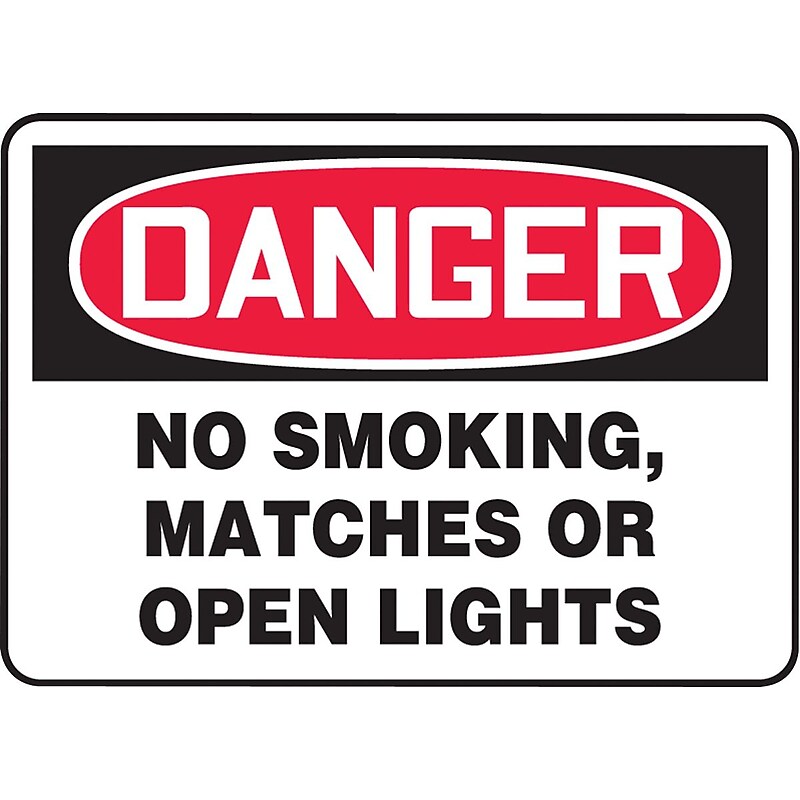 Safety sign made of adhesive vinyl. Measures x 10". DANGER NO SMOKING, MATCHES OR OPEN LIGHTS. 004" thick Adhesive Vinyl. x 10". Square corners and scored backing for quick peel-off and application. Printed matte surface with permanent acrylic adhesive. Moisture-resistant. Indoor or sheltered environments. Complies with OSHA 29 CFR 1910. 145 and ANSI Z535 requirements.