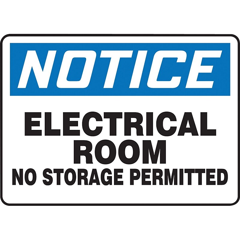 Safety sign made of adhesive vinyl. Measures x 14". NOTICE ELECTRICAL ROOM NO STORAGE PERMITTED. 004" thick Adhesive Vinyl. x 14". Square corners and scored backing for quick peel-off and application. Printed matte surface with permanent acrylic adhesive. Moisture-resistant. Indoor or sheltered environments. Complies with OSHA 29 CFR 1910. 145 and ANSI Z535 requirements.
