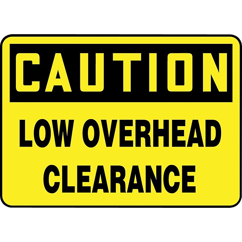 Safety sign made of adhesive vinyl. Measures x 10". CAUTION LOW OVERHEAD CLEARANCE. 004" thick Adhesive Vinyl. x 10". Square corners and scored backing for quick peel-off and application. Printed matte surface with permanent acrylic adhesive. Moisture-resistant. Indoor or sheltered environments. Complies with OSHA 29 CFR 1910. 145 and ANSI Z535 requirements.