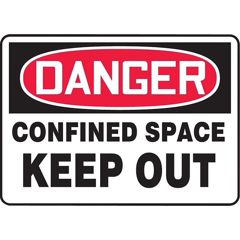 Safety sign made of adhesive vinyl. Measures x 14". DANGER CONFINED SPACE KEEP OUT. 004" thick Adhesive Vinyl. x 14". Square corners and scored backing for quick peel-off and application. Printed matte surface with permanent acrylic adhesive. Moisture-resistant. Indoor or sheltered environments. Complies with OSHA 29 CFR 1910. 145 and ANSI Z535 requirements.