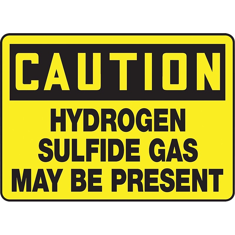 Safety sign made of adhesive vinyl. Measures x 10". CAUTION HYDROGEN SULFIDE GAS MAY BE PRESENT. 004" thick Adhesive Vinyl. x 10". Square corners and scored backing for quick peel-off and application. Printed matte surface with permanent acrylic adhesive. Moisture-resistant. Indoor or sheltered environments. Complies with OSHA 29 CFR 1910. 145 and ANSI Z535 requirements.