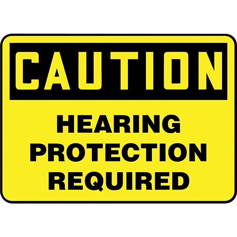 Safety sign made of adhesive vinyl. Measures x 10". CAUTION HEARING PROTECTION REQUIRED. 004" thick Adhesive Vinyl. x 10". Square corners and scored backing for quick peel-off and application. Printed matte surface with permanent acrylic adhesive. Moisture-resistant. Indoor or sheltered environments. Complies with OSHA 29 CFR 1910. 145 and ANSI Z535 requirements.