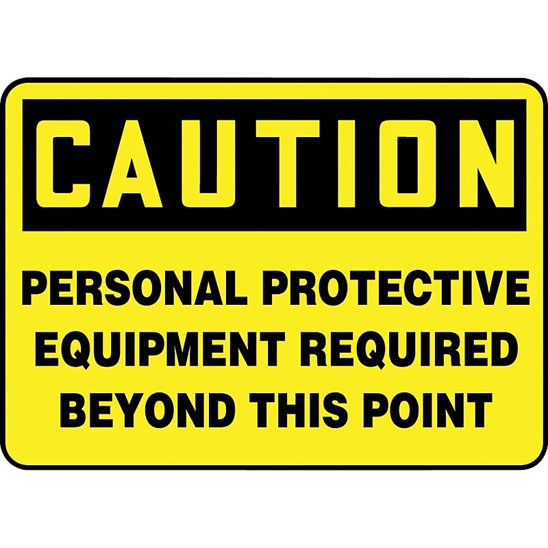 Safety sign made of adhesive vinyl. Measures x 14". CAUTION PERSONAL PROTECTIVE EQUIPMENT REQUIRED BEYOND THIS POINT. 004" thick Adhesive Vinyl. x 14". Square corners and scored backing for quick peel-off and application. Printed matte surface with permanent acrylic adhesive. Moisture-resistant. Indoor or sheltered environments. Complies with OSHA 29 CFR 1910. 145 and ANSI Z535 requirements.