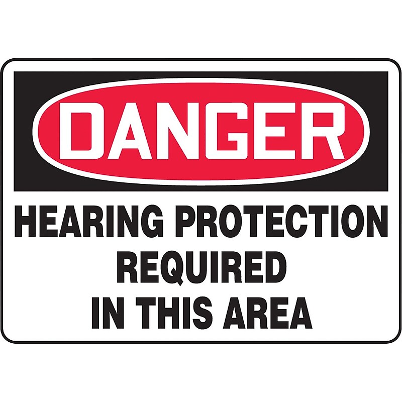 Safety sign made of adhesive vinyl. Measures x 14". DANGER HEARING PROTECTION REQUIRED IN THIS AREA. 004" thick Adhesive Vinyl. x 14". Square corners and scored backing for quick peel-off and application. Printed matte surface with permanent acrylic adhesive. Moisture-resistant. Indoor or sheltered environments. Complies with OSHA 29 CFR 1910. 145 and ANSI Z535 requirements.
