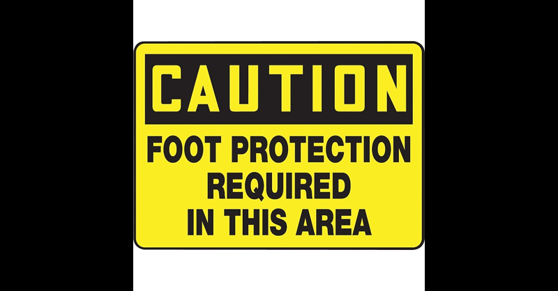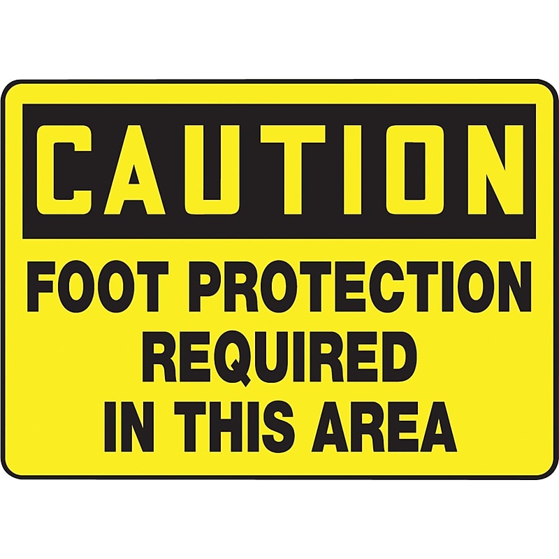 Safety sign made of adhesive vinyl. Measures x 10". CAUTION FOOT PROTECTION REQUIRED IN THIS AREA. 004" thick Adhesive Vinyl. x 10". Square corners and scored backing for quick peel-off and application. Printed matte surface with permanent acrylic adhesive. Moisture-resistant. Indoor or sheltered environments. Complies with OSHA 29 CFR 1910. 145 and ANSI Z535 requirements.