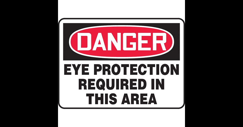 Safety sign that conveys your commitment to safety as a priority in your facility. 14". 055" thick Plastic. DANGER EYE PROTECTION REQUIRED IN THIS AREA. Rounded corners with 3/16" mounting holes for easy installation. Good impact resistance and surface image with non-glare finish. Indoor or outdoor, contains UV inhibitors. Manufactured with 50% recycled plastic and is recyclable (Code 2). Complies with OSHA 29 CFR 1910. 145 and ANSI Z535 requirements.