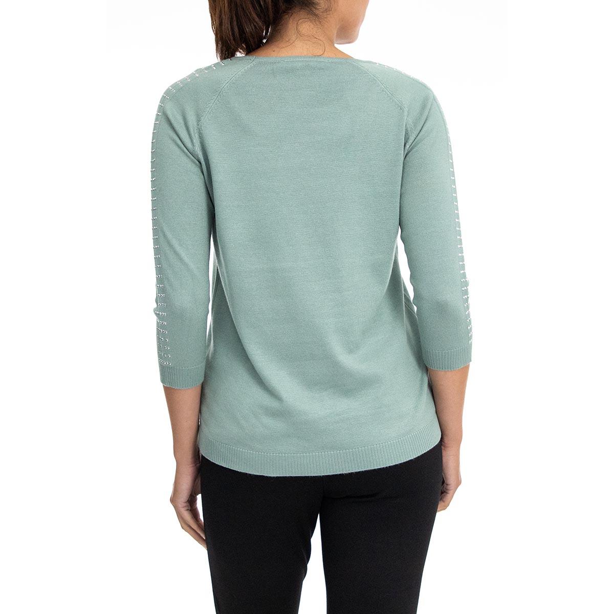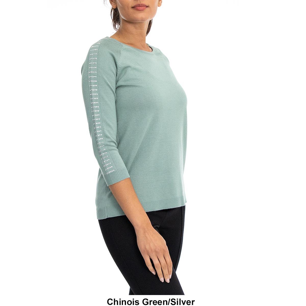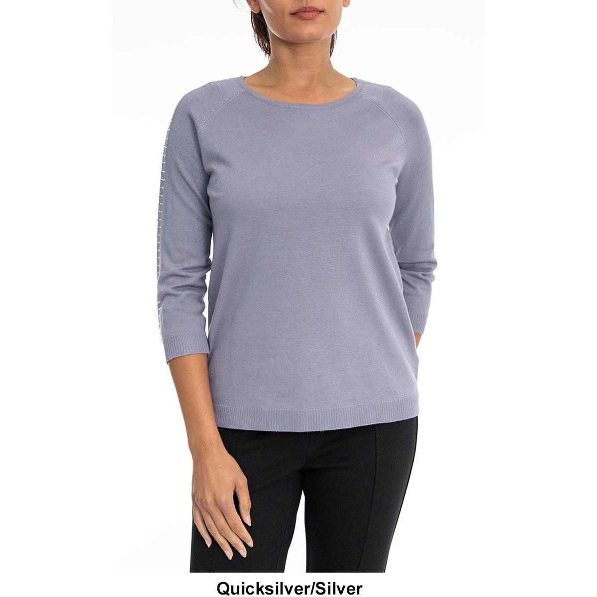 Pattern: Solid Sleeve Length: 3/4 Sleeve Neck: Scoop Neck Bedazzled lattice sleeve Rib-knit cuffs & hemline Saddle shoulder styling Linear hemline Cool iron.
