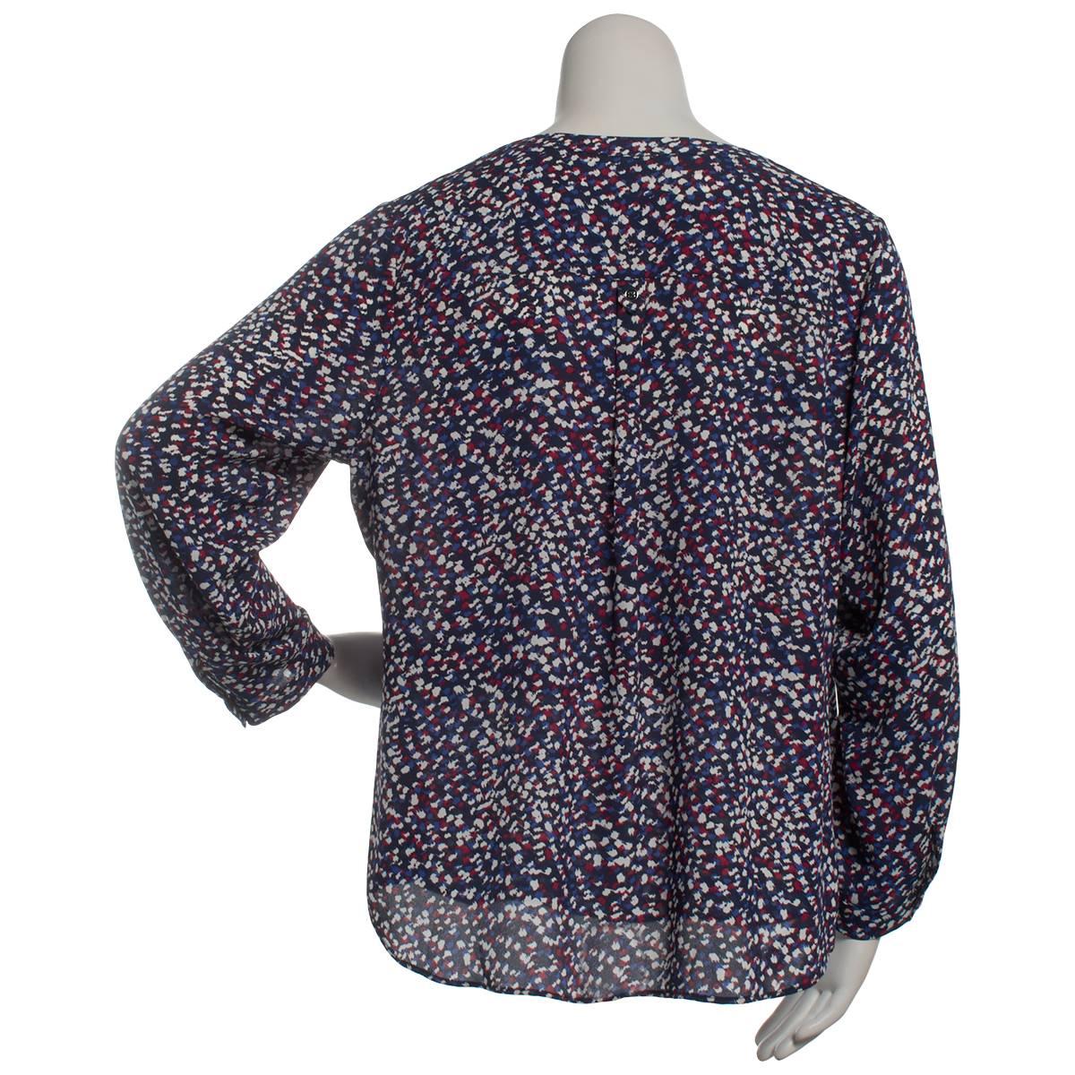 Pattern: Geo Dots Sleeve Length: 3/4 Sleeve Neck: Split Neck Adjustable interlock sleeve 1/2 Button placket Rear box pleat Rounded hem Cool iron.
