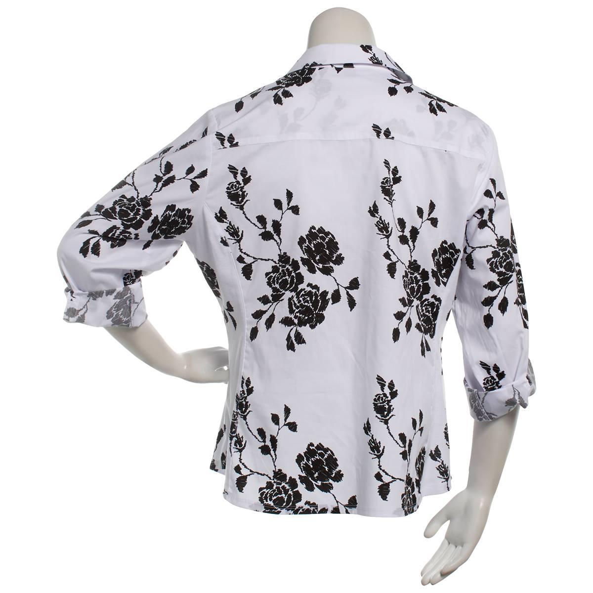Pattern: Floral Sleeve Length: 3/4 Sleeve Collar: Spread Full button front closure Adjustable interlock sleeves Knitted to fit Linear hem Cool iron.