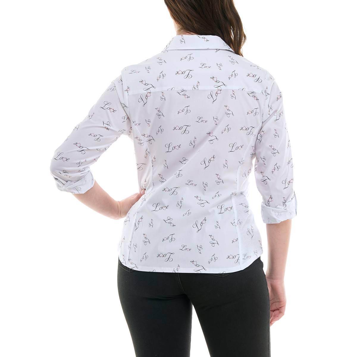 Pattern: Allover Love Script Sleeve Length: 3/4 Sleeve Collar: Spread Collar Adjustable interlock sleeves Full-length button closure Knitted side panels Rounded hemline Cool iron.