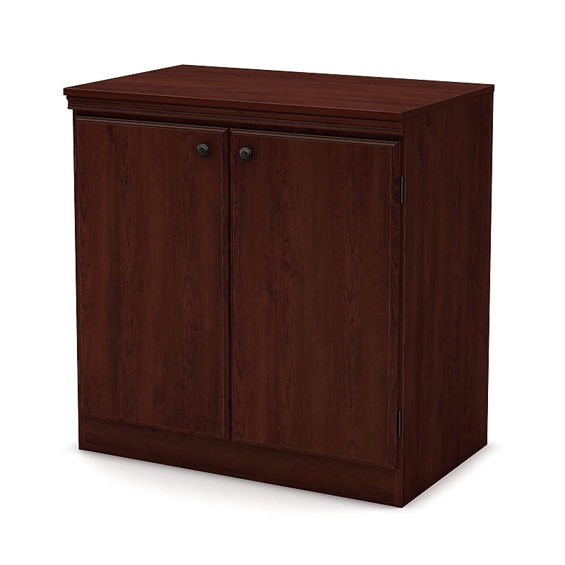 South Shore Morgan Laminated particleboard storage cabinet finish measuring 32" x 31" x 18" features storage spaces behind the door with one adjustable shelf. Cabinet with black finished metal handles is eco-friendly and durable. Royal cherry laminated particleboard. Metal handles in a black finish. Dimensions: 32"(H) x 31"(W) x 18"(D). 2 shelves with storage capacity 7. 5 cu. ft. Full assembly required. Style: Transitional. Designed to maximize storage in all the rooms of your home. Both stylish and practical, perfect for all storage needs. It works well in any room, whether it is the office, bedroom, basement, entryway or even the garage. Certifications and standards: ISTA 3A certified. Warranty: 5 years limited. ⚠ WARNING: This product can expose you to chemicals including formaldehyde, which is known to the State of California to cause cancer or birth defects or other reproductive harm. For more information go to www. P65Warnings. ca. gov/furniture. South Shore Morgan 32" Laminated particleboard storage cabinet finish is designed to maximize storage capacity, is perfect for all storage needs and is stylish.