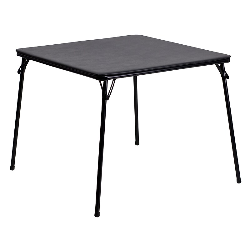 Whether you're hosting a game night or attending one, this square folding table can travel or offer a quick setup for other players. Thecard table is an instant win due to its lightweight, portable design. This light folding table with collapsible legs is perfect for everything from weddings, baby showers, and banquets to game nights with family and friends or that 1,000 piece puzzle you've wanted to tackle. This temporary dining table seats extra dinner guests, provides a space for arts and crafts and is a wise investment for any mobile catering business. Uniquely designed with a vinyl-covered padded top, the table's surface prevents cards from sliding off of the table while providing ease of cleaning. When no longer in use, fold the legs in and store away. Square Game and Card Tables. Color: Black; Material: Foam, Medium Density Fiberboard, Metal, Plastic, Vinyl. Seats up to 4 Adults. Overall Dimensions: 33. 5"W 33. 5"D 27. 75"H; Shape: Square. Weight Capacity: 130 lbs. Evenly Distributed. Rated for Commercial Use. Fully Assembled. Multipurpose Folding Table: Game Table, Card Table, Dining Table. Comfortable seating for up to 4 Adults. 1875" Thick Black Vinyl Top with CAL 117 Fire Retardant Sponge Foam. Powder Coated Legs Fold underneath table top. Plastic Floor Glides keep floors free from damage. Folding table for hospitality facilities, banquet halls, hotel, and home use. Foldable table for dining room, banquet halls mobile caterers, and traveling salespersons. Warranty: 1 Year Limited. When it's your turn to host game night or need to accommodate additional people for dinner, having this handy table will keep you prepared.