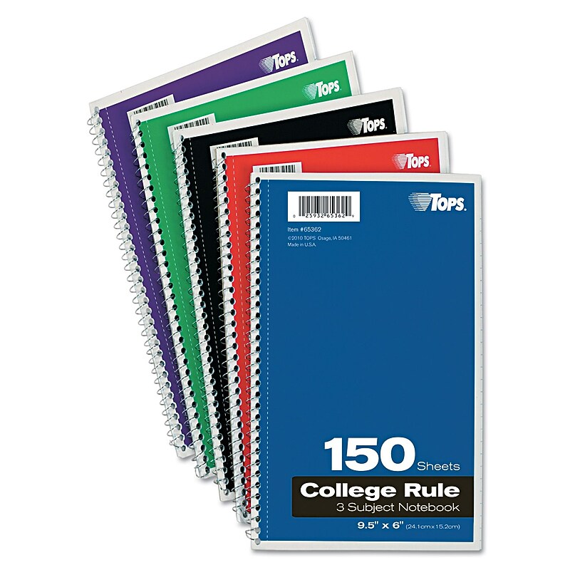 Oxford 3-Subject Notebooks come in bright colors with 2 dividers. No-snag coil. Proudly made in the USA. x 9-1/2". College ruled, 150 sheets. Blue, green, violet, red or black. Colors randomly assigned per order. 3-Subject Notebook. 150 Sheets; x 9-1/2". College Ruled. Perforated sheets. Spiral Bound. Made in the USA. 9-1/2" x 3 subject wirebound notebook has 2 plain kraft dividers and assorted color covers.