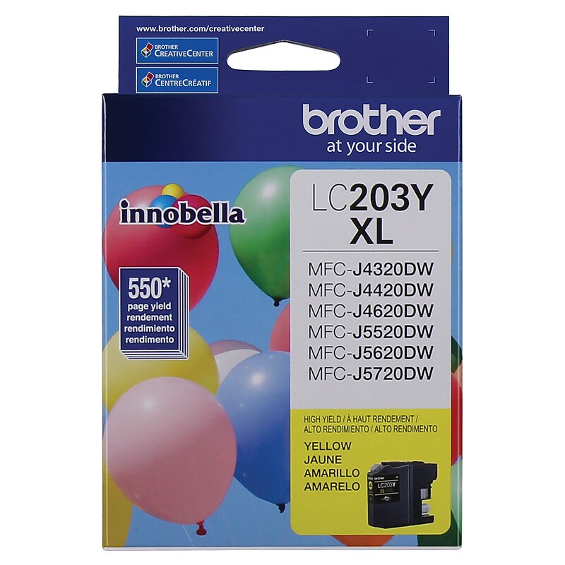 With Brother LC203 High Yield Ink Cartridges (LC203MS) you'll get rich fade-resistant results, time after time and you'll save money. Compatible with: Brother MFC-J4420DW, MFC-J460DW, MFC-J4620DW, MFC-J4620DWF, MFC-J480DW, MFC-J485DW, MFC-J5520DW, MFC-J5620CDW, MFC-J5620DW, MFC-J5720CDW, MFC-J5720DW, MFC-J680DW, MFC-J880DW. Page Yield of up to 550 pages*. Intelligently engineered to work in seamless unison with your Brother inkjet printer. Brother Genuine LC203Y High-Yield Yellow Ink Cartridge. Brother Genuine ink produces rich, vivid color prints that withstand the test of time. Brother offers an environmentally responsible way for customers to dispose of Brother Genuine cartridges. Visit www. brother-usa. com/Environment to learn more. Disclaimer: *All page yields are approximate and are calculated in accordance with ISO/IEC 24711; for additional page yield info, see manufacturers website. Produce vivid color prints with this Brother LC203 yellow high-yield ink cartridge.
