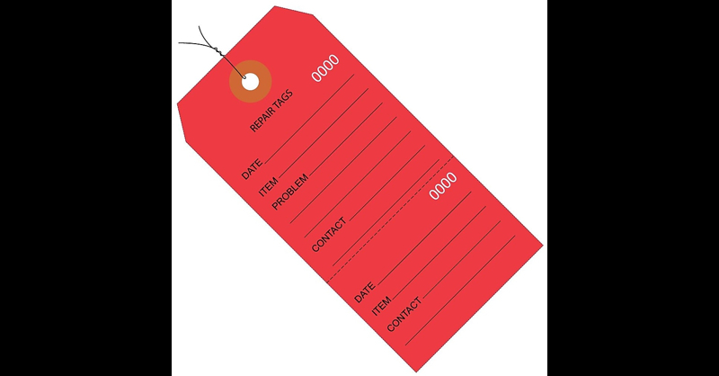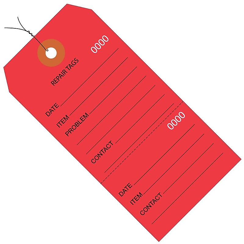 BOX Pre-wiredrepair tag measuring 6 1/4" x 3 1/8" features a reinforced, tear resistant eyelet for convenient handling. #8 Tag is consecutively numbered for easy tracking and is sold as 1000 per pack. Red Consecutively numbered 0000-0999. Dimensions: 6 1/4"(H) x 3 1/8"(W). Tags are pre-wired. 1000/pack. One part is given to the customer and the other says with the product. BOX Red repair tag measuring 6 1/4" x 3 1/8" is sequentially numbered in order to maintain records and is pre-wired for convenience, sold as 1000 per pack.