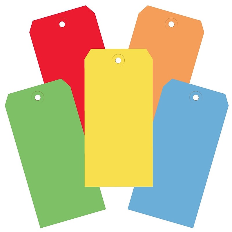 BOX 13 pt #5 Tag having 3/16" reinforced, tear resistant eyelet can be attached with the help of a string or wire. Tag is sold as 200 each of red, blue, green, yellow and orange tags. Aid in coding shipments and inventory. Dimensions: 4 3/4"(H) x 2 3/8"(W). 1000/pack. Feature a 3/16" reinforced, tear resistant eyelet. Include 200 each of red, blue, green, yellow and orange tags. Colored tags aid in coding shipments and inventory. May be attached with string or wire. 13 points. Freight class: 55. BOX 13 pt #5 Tag colors measuring 4 3/4" x 2 3/8" enables to create a color code system for shipments and inventory, sold 1000 per pack.