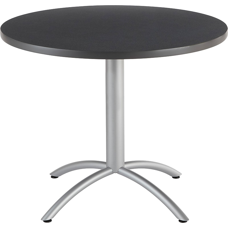 Round cafe table. 30"H x 36"diameter.top, silver base INCLUDED. Cafe table is part of the Iceberg CafeWorks Cafe and Bistro Tables and Seating that is ergonomically designed for comfort and contemporary style. 1-1/8" thick, round melamine top features a wear-resistant design with vinyl, T-mold edging. Top is made of furniture-grade particleboard core. Melamine-sealed underside prevents moisture absorption. The sleek and contemporary, sturdy all-steel base features a powder-coated silver finish. Adjustable feet help compensate for uneven flooring. Cafe dining table features a height to fit perfectly with CafeWorks cafe chairs with 18" seat heights. Please contact your Account Manager for large quantity orders of 50 or more tables.