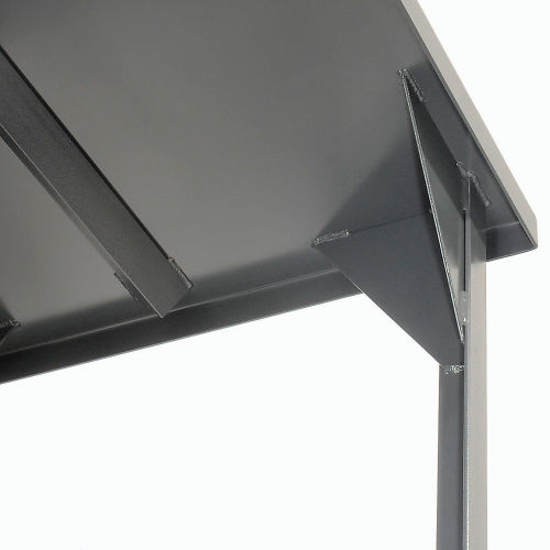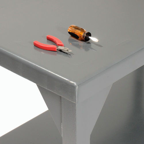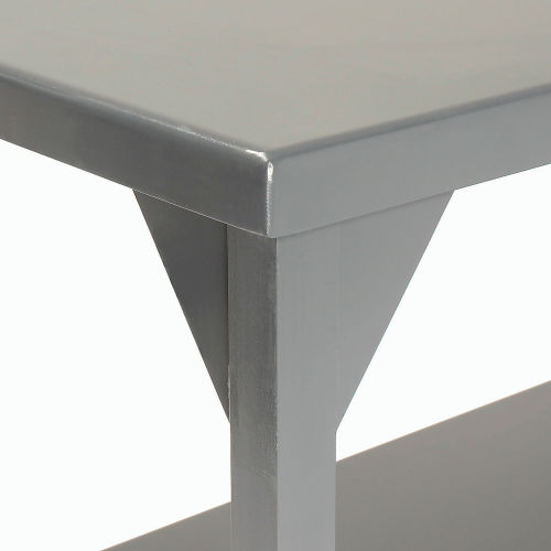 These all welded work tables are perfect for all heavy duty industrial and manufacturing environments including factories, garages, assembly, maintenance areas, and more. 7 Gauge Steel Work Surface. The top of these industrial shop tables is supported by 2" x 2" x 1/4" thick angled steel legs with welded anchor plates. 12 gauge x 22"D bottom shelf of this work bench provides added storage space. Scratch resistant baked enamel finish. Fixed Height Benches are 34"H.