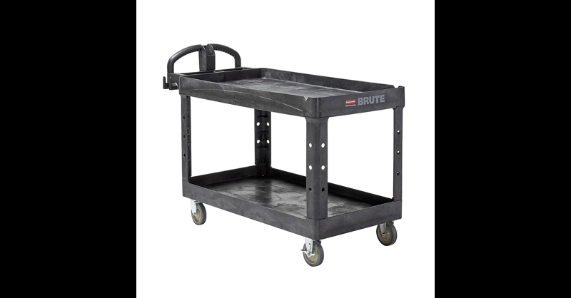 Rubbermaid heavy-duty, two-shelf plastic utility cart features large 4-inch wheels that ensure easy transference of materials throughout almost any working environment without leaving marks on floors. A high-density, lightweight structural foam construction is sturdy enough to stand up under 375 pounds per shelf. The cart includes an ergonomically designed push bar that allows you to control the cart at a comfortable height for optimal control and personal safety. Keep small accessories handy with the built-in storage compartments, notches, hooks and pouches.plastic. Lightweight, sturdy structural foam utility cart transports materials weighing up to 375 pounds per shelf. Dimensions: 33 1/4" x 26" x 55". Four 4" non-marking swivel casters make the cart easily maneuverable. Built-in power strip conveniently positions electronic plugs within easy reach. Ergonomic push bar enhances cart control and handler safety. Rubbermaid heavy-duty, two-shelf plastic utility cart transports your heavy materials and supplies with easy maneuverability in most environments.