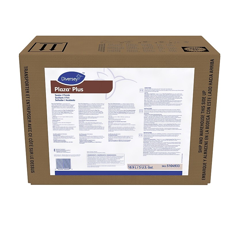 Improve the quality and durability of flooring with this hard surface floor sealer and finish. The composition is safe to use on brick, granite, terrazzo, slate, quarry tile, and multiple other materials, offering a wide range of possible uses, and the self-leveling compound provides an even finish. This Diversey Plaza floor sealer and finish comes in a 5-gallon Envirobox, providing plenty for high-volume flooring needs. Long-lasting, high gloss liquid sealer. oz. per Envirobox. Used for sealing and finishing worn granite, marble, terrazo, and other stone floors. Product seals and finishes, can be applied, maintained and removed like any conventional finish. Comes Safety Data Sheet . Enrich flooring with this Diversey Plaza Plus hard surface floor sealer and finish.
