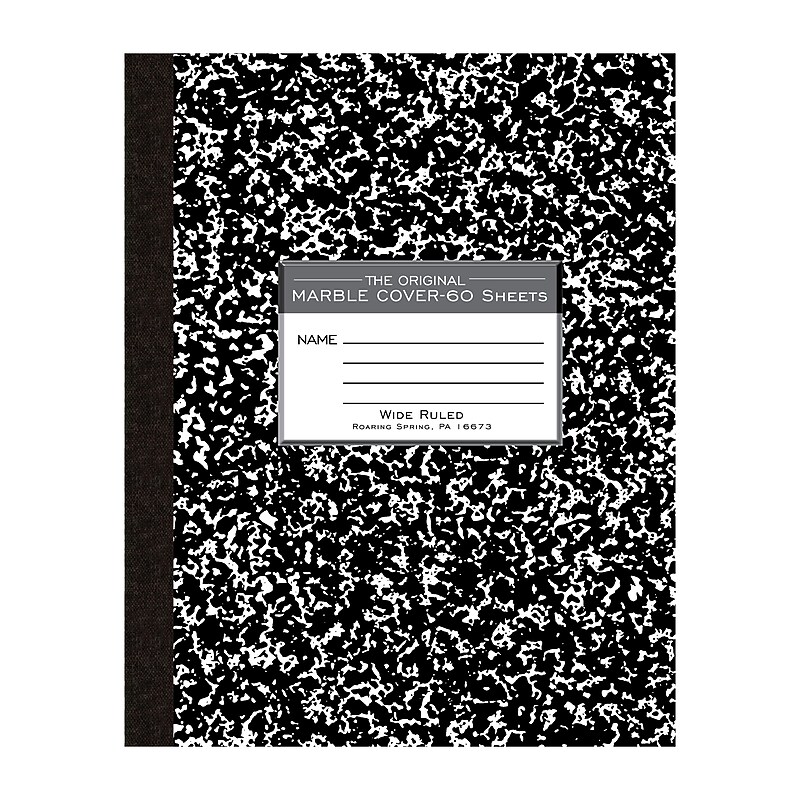 Record your notes in thiscomposition book. The flexible cover makes it easy to store this composition book in a backpack, while the sturdy backing provides a solid writing surface. This Roaring Spring Paper Products composition book has 60 sheets of 15 lb. paper and features a center-sewn, tape bound construction, so you don't have to keep track of loose pages. Composition book. Each. 60 Sheets; 9. 75" 7. 75" . 33". Wide Ruled With Margin. Flexible Paperboard with Black Marble Design. Tape & Sewn. Record your notes in this permanently bound 60-sheet wide ruled flexible covercomposition book.