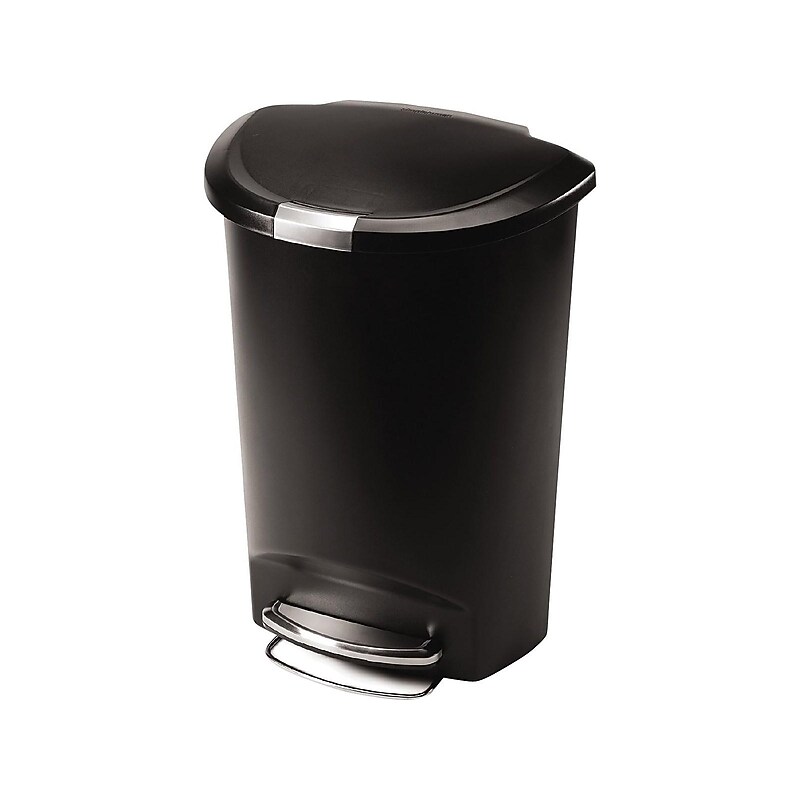 Raise the lid of this waste bin via a steel foot pedal for hands-free access. Its semi-round shape fits snugly against walls, and the slide-lock lid deters curious children and pets. This simplehuman waste receptacle is made from durable plastic to stand up to daily use. Semi-round step trash can ensures clean and litter-free space and provides hands-free operation. gal. storage capacity to easily accommodate all your waste. Made ofplastic for long-lasting use. Dimensions: 26. 5"H x 18. 9"W x 14"D. Flip lid opens easily and gently swings back into place, while lid shox technology controls the motion of the lid for a slow, silent close; slide lock securely locks the lid to help keep pets and curious children from getting into the trash. Touch-free feature prevents the cross-contamination of germs. Strong steel accent pedal engineered for a smooth and easy step. Profile hinge is slimmer than traditional hinge designs allowing you to place the can closer to the wall. 5-year manufacturer limited warranty. Store up to gallons of household waste in thissimplehuman trash can.