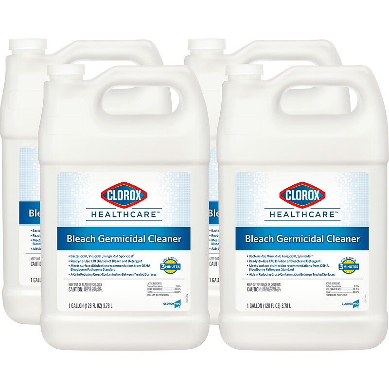 Your proven bleach solution for cleaning. Clorox Healthcare Bleach Germicidal Cleaner is a 1-step cleaner disinfectant that is EPA registered to kill C. difficile* and C. auris in 3 minutes and 50 other microorganisms in 1 minute or less. ** This professional germicidal disinfectant contains a 1:10 bleach dilution to meet CDC & OSHA guidelines for disinfecting surfaces in healthcare settings and has proven efficacy against outbreak causing viruses, emerging viral pathogens, MRSA and VRE. Clean, disinfect, and deodorize surfaces with an optimized formula that leaves less residue behind. Use in healthcare settings including hospitals, medical facilities, dental offices, veterinary offices and long term care facilities. *Follow special instructions for cleaning prior to disinfection. **When used according to the disinfection directions. A precleaning step is required to kill Clostridioides difficile and Candida auris. ****Analysis of Clorox Healthcare customer sales data, November 2023. GERMICIDAL BLEACH : This one step** cleaner disinfectant is EPA registered to kill C. difficile* and C. auris in 3 minutes and 50 other microorganisms in 1 minute or less;** Pack may vary. ONE STEP** CLEANER DISINFECTANT: Clean, disinfect and deodorize surfaces with an optimized formula that leaves less residue behind. CLOROX DISINFECTING WIPES: Kill HAI causing pathogens in 3 minutes or less; Proven efficacy against C. difficile* spores, C. auris, outbreak causing viruses, emerging viral pathogens, MRSA and VRE. PROFESSIONAL BLEACH DISINFECTANT: Meets CDC & OSHA guidelines for disinfecting surfaces in healthcare settings with a 1:10 bleach dilution. FOR USE IN HEALTHCARE SETTINGS: Use in hospitals, medical facilities, dental offices, veterinary offices and long term care facilities; recommended in equipment cleaning and care guides. Professional bleach disinfecting cleaner is EPA registered to kill C. diff* and C. auris in 3 minutes and recommended for use in healthcare settings.