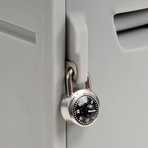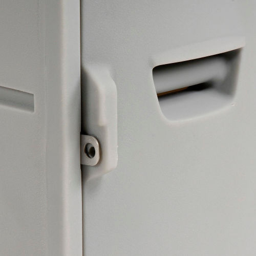 Rugged plastic lockers withstand food service wash-downs and are ideal for damp conditions like pools or ice rinks because they cannot rust or corrode. Because they also operate quietly, they're ideal for schools. Includes louvers, double-walled doors and a number plate This tier model also includes a double coat hook and a flat top. Gray color. These stackable units can be mixed and matched to create your own configurations. Lockers are priced and ordered per opening. Order 2 units to configure a two-tier locker. For sloped top 2 tier lockers, order 1 slope top and 1 flat top opening.