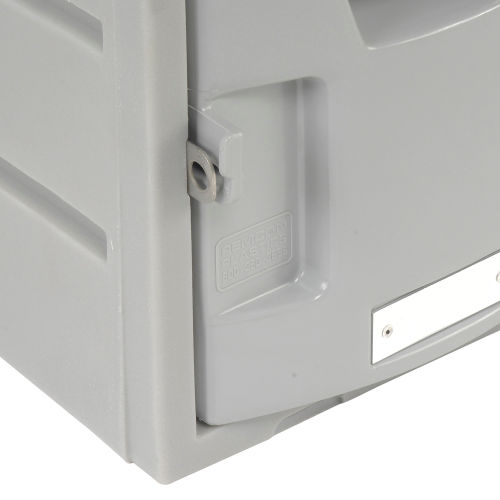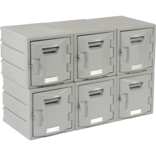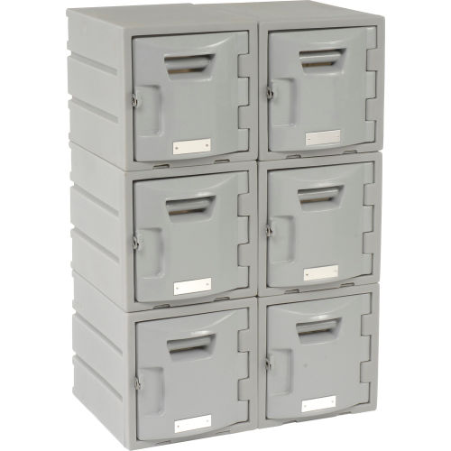 Rugged plastic lockers withstand food service wash-downs and are ideal for damp conditions like pools or ice rinks because they cannot rust or corrode. Because they also operate quietly, they're ideal for schools. Includes louvers, double-walled doors and a number plate. This tier model has a flat top. These stackable units can be mixed and matched to create your own configurations.Gray color. Lockers are priced and ordered per opening. Order 6 units to configure a 6-tier locker. For sloped top 6 tier lockers, order 1 slope top and 5 flat top opening.