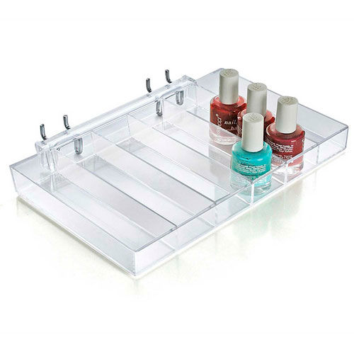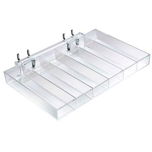 Six-compartment tray measures 10"W x 6"D x 1"H. Each slot measures 1.5"W x 5.6875"D. Use this tray on pegboard, slatwall, or counter top. Includes two U-Hooks. Choose to add a c-channel or flip-up c-channel. For use on counter, pegboard or slatwall.