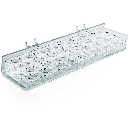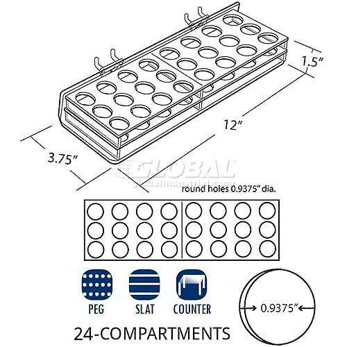 Wide High 3.75" Deep Cosmetic Tray with 24 Round Compartments. Each compartment measures .9375" in diameter. For use on countertops, pegboard or slatwall. 2 plastic hooks attached for easy mounting.