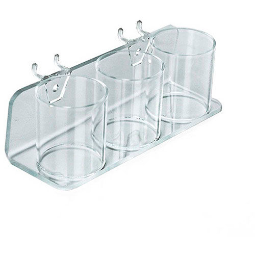 This 3 Cup Tray is made of Clear Acrylic and can be used on any pegboard or slatwall system. It measures 8"w x 2.75"d x 2.75"h. It has hooks attached on for easy mounting.